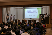 北小、南小の6年生が一堂に会し、今年度総合的な学習の時間で取り組んできた活動報告を行いました。北小6年生は、ホタルが棲む自然環境について発表し、最後に、3年間取り組んできたほたる太鼓の演奏を披露しました。